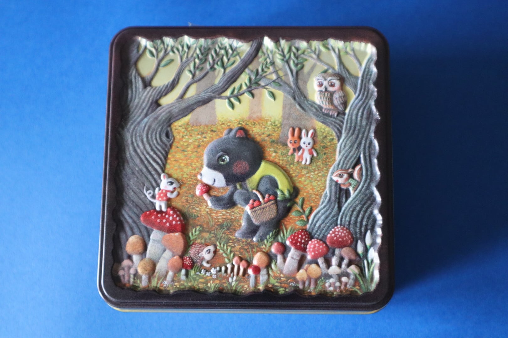 ケントハウスで大人気のクッキー缶「ネコとリス」の作者である、絵本作家のたなかしんがデザインした第二弾の「くまときのこ」缶です。