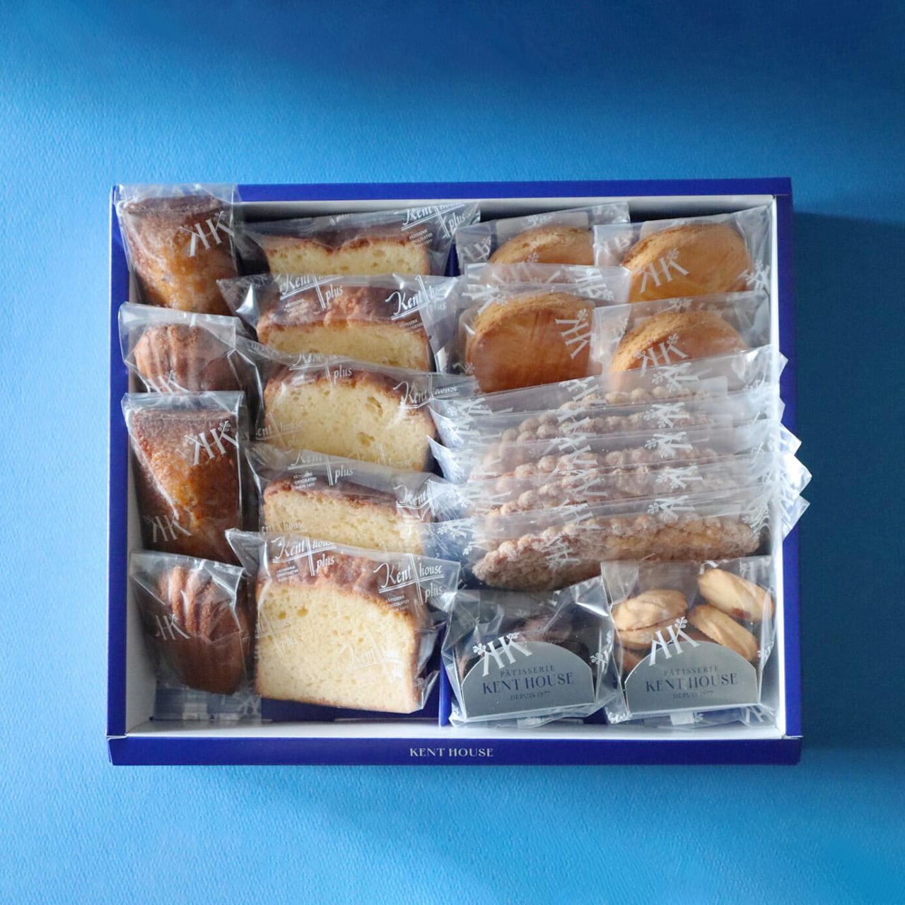 ケントハウスこだわりのマドレーヌやフィナンシェ、パウンドケーキやガレットブルトンヌの他、人気の高い焼き菓子をこれ一箱に全て詰め込んだケントギフトです。
